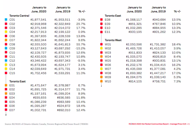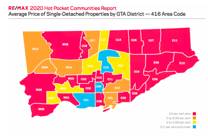 RE / MAX的最新发布的2020年Hot Pocket社区报告显示,在过去半年中,在大多伦多地区95%的房地产区中,独立屋中又55%以上升值的数目超过了两位数。